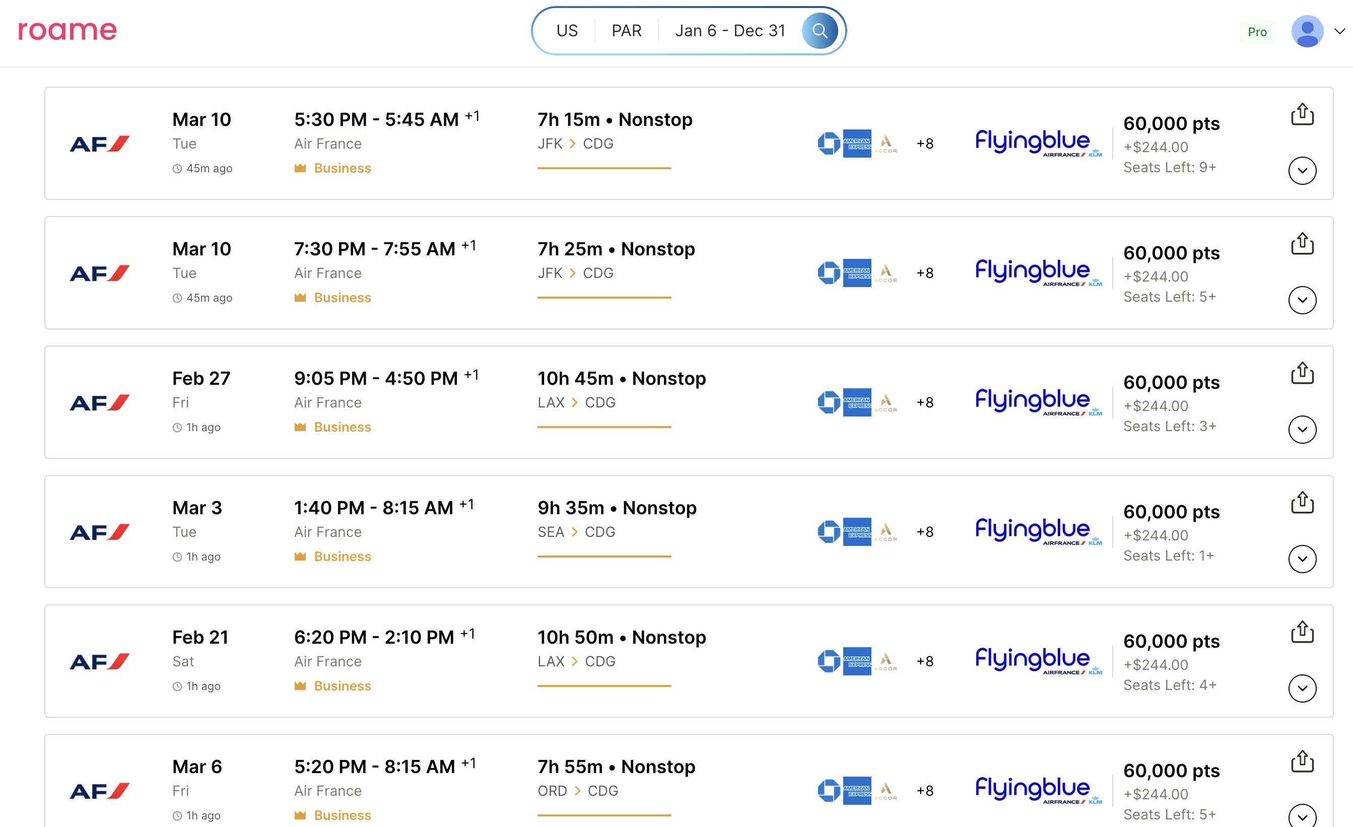Newark to Paris: 2/6, 2/24, 2/26, 2/27, 3/9
