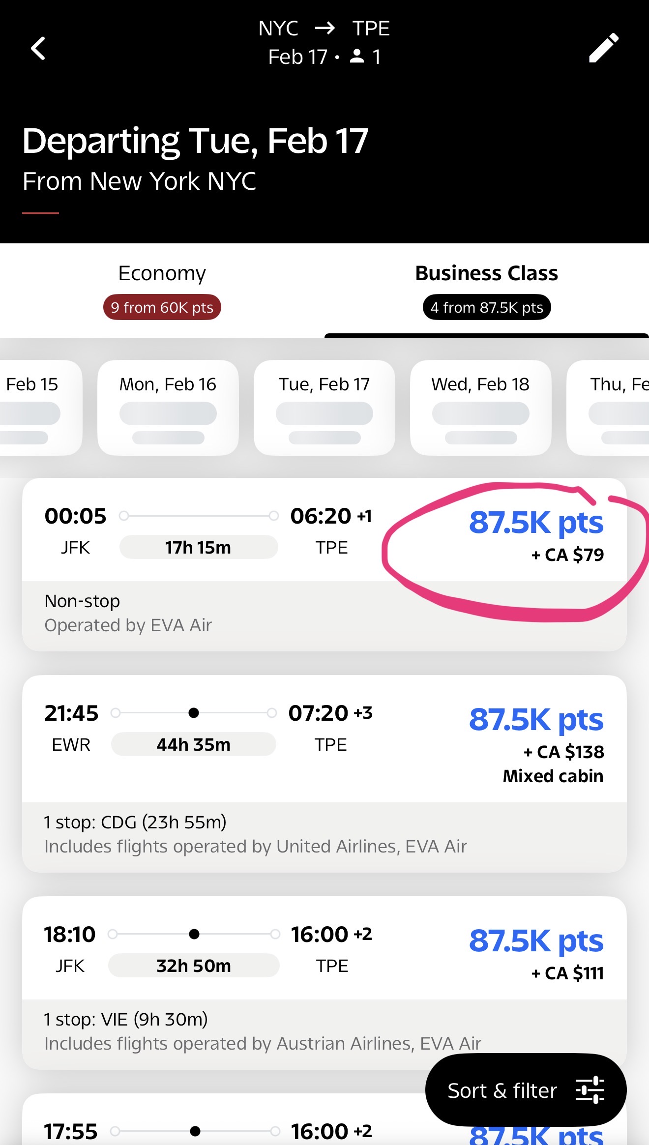 Only 75K to 88K points to fly EVA Air business class to Taipei (various airports)